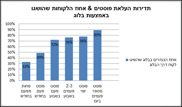 ניתן לומר שקיימת קורלציה ישירה בין תדירות כתיבת פוסטים בבלוג לבין שיעור הלקוחות שהגיעו בזכות הבלוג .בעלי בלוג שהעלו פוסטים בקצב יומי זכו למירב התועלת בהשגת לקוחות באמצעות מדיה זו.