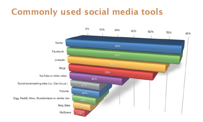 כמובן אין מחקר שלם מבלי לבדוק את שאלת השאלות – איזה רשת פופולארית ביותר… מהתוצאות הנראות בגרף מתחת ניתן לראות שביתרון משמעותי מובילות ארבע רשתות חברתיות: טוויטר,פייסבוק לינקאין ובלוגים.מדיות אלו מהוות את ארבעת האמצעים החברתיים המובילים והפעילים ביותר כשלטוויטר יתרון קטנטן על האחרים.כיוון שברשותינו נתונים ממחקר דומה בשנת 2009 ניתן לראות את המגמות שחלו במהלך שנת פעילות אחת- את הקפיצה המשמעותית עשתה ללא ספק פייסבוק ועשתה דרכה מהמקום הרביעי בחשיבותו למקום השני המכובד. מדיה זו גם דווחה כערוץ המפגש הראשון למשתמשים חדשים הנכנסים לעניין. כשאת לינקאין מאפיינים בעיקר עסקים קטנים העושים בו שימוש לקשרים עסקיים הרבה יותר מאשר עובדים בחברות גדולות.