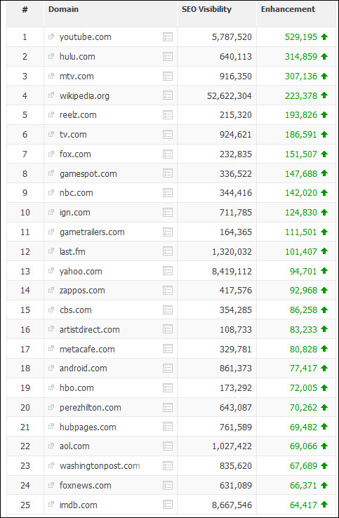 יוטיוב you tube היא ללא ספק המרוויחה הגדולה לפי תוצאות המחקר הזה, ולצידה אתרי וידאו נוספים- HULU, MTV, NBC,CBS,HBO ועוד. אתר METACAFE למשל הוא עוד אחד מהמרוויחנים הגדולים של עדכון גוגל פנדה האחרון. מדובר באתר שמאחסן סרטוני וידאו חינם וקיבל מעל 1,250 דרוגים של גוגל פלוס +1.