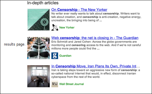 כך לדוגמא אם תחפשו בעתיד מידע על “צנזורה” תקבלו מידע ממגוון מגאזינים כשלצד כל תוצאה מופיע לוגו המגאזין או מקור הכתבה כפי שמופיע בפרופיל גוגל פלוס המקושר לאותו מגאזין/חברה.